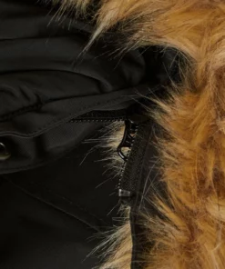 - Kapuze mit Volumenregulierung hinten (mit Klettverschluss) und abtrennbarem Kunstpelz-Besatz