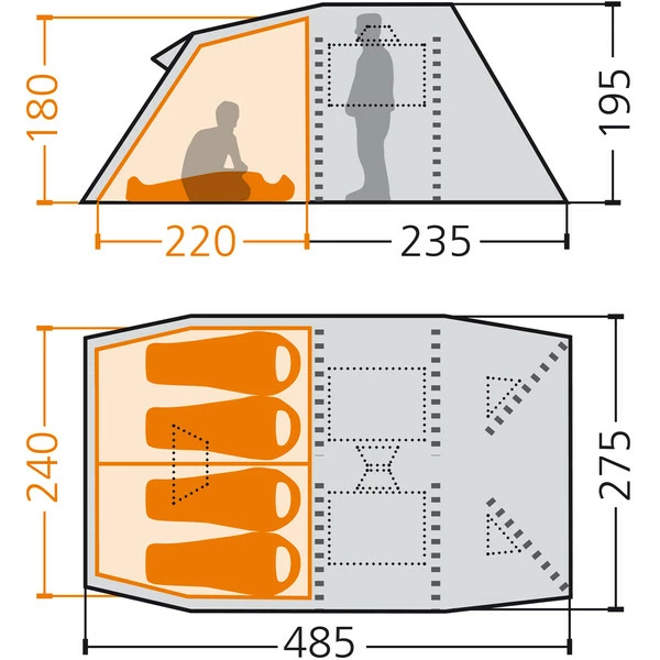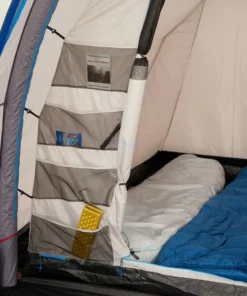 Das Innenzelt bietet Platz für 4 Personen und kann in der Mitte mit einer Stoffbahn getrennt werden. Vier Innentaschen bieten jeder Person eine Möglichkeit Kleinigkeiten zu verstauen. Zusätzlicher Platz ist im Organizer in der Apsis vorhanden. Diese erreicht mit 195 cm Stehhöhe, bietet zwei Fenster, genügend Platz für einen Tisch mit Stühlen und eine RV-Kabeldurchführung, damit du Strom im Zelt hast. Zum Schutz vor Schmutz ist eine feste Bodenwanne im gesamten Zelt eingenäht, die auch das Aufsteigen kondensierender Bodenfeuchtigkeit verhindert.